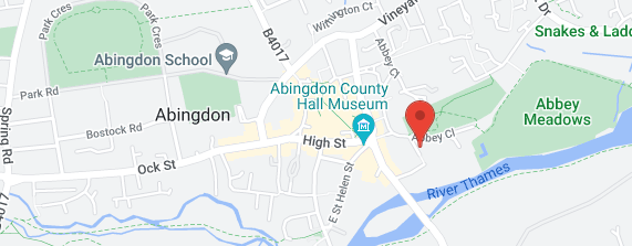 Head for Abingdon town centre and take the turn for Abbey Close at the traffic lights on the Vineyard. At busy periods the car parks ahead of you (Cattle Market and Civic) are easier to park in. From here walk through the park or into Abbey Close to get round the large redbrick council building ahead of you.